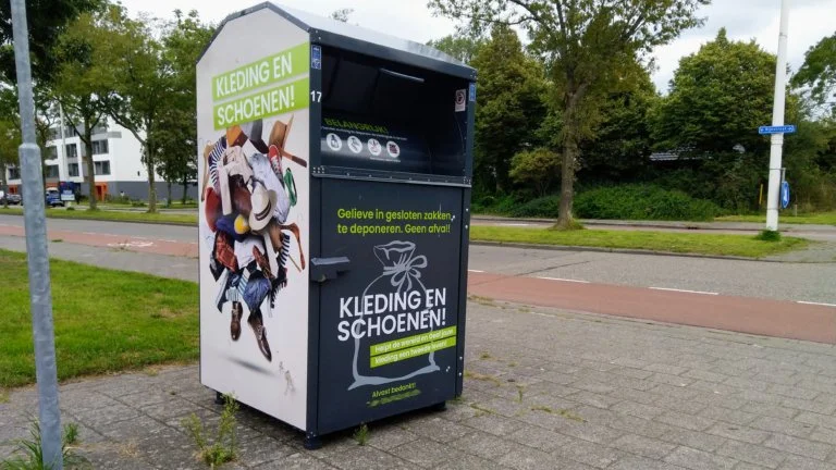 Voor de gesloten kringloopwinkel stond een kledingbak. Samen probeerde we de tas erin te krijgen, maar de klep wilde maar niet dicht.